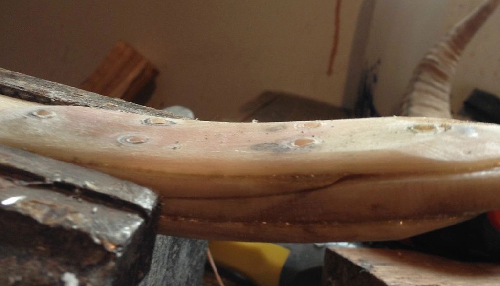 The bow before being backed with sinew. Notice the tiller is very uneven. This is tillered with heat. Not by removing horn as is done in wood bows.
