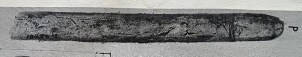 The picture left is of a bighorn bow fragment found in Elko county Nevada. It was found in a large rock shelter. Date unknown. The belly is more rounded than the back. The back has been roughed for the sinew backing There is still a sinew wrap near the tip where the nock would have been. There is also evidence of a full backing and a dark substance that may have once been glue. The fragment is 22.3 cm long and 12 by 24.5mm in thickness and width. It may be quite old.
