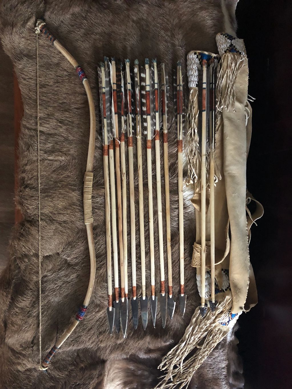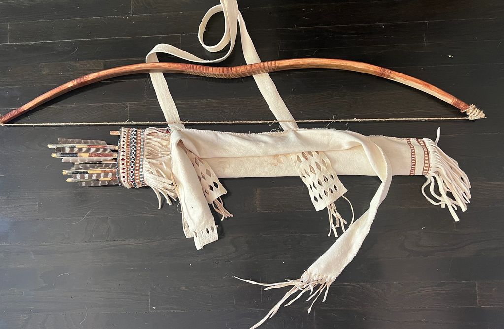 Lakota style set. Sinew backed ash bow, dogwood arrows, brain tanned deer quiver with old time beads real sinew sewn and beaded.