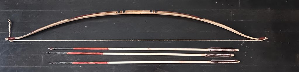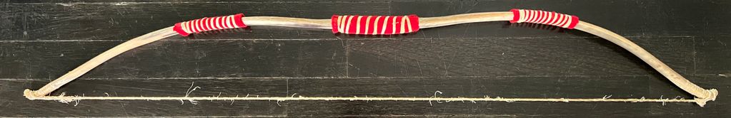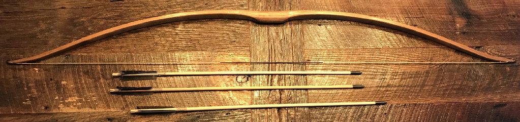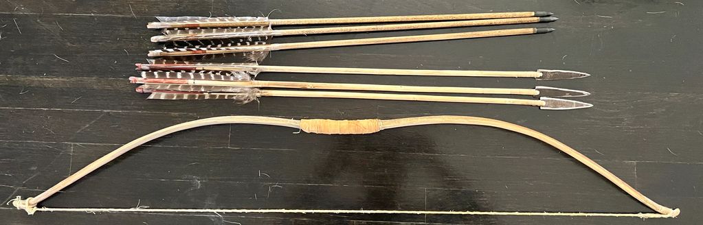 Seminole style hickory with deer hide string. Arrows of rose and vibrunum with bone and stingray barb points