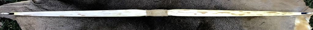 Composite horn bow. Water buffalo horn belly, maple core, sinew backing covered with birch bark. Halibut skin handle. 49" long 65# draw at 28"