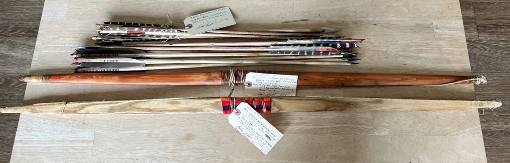 Eastern Woodlands sets. Naraganset copy hickory bow. Naskapi copy sugar maple bow and brain tanned quiver. Deer sinew strings 2 ply. Arrows are hickory.