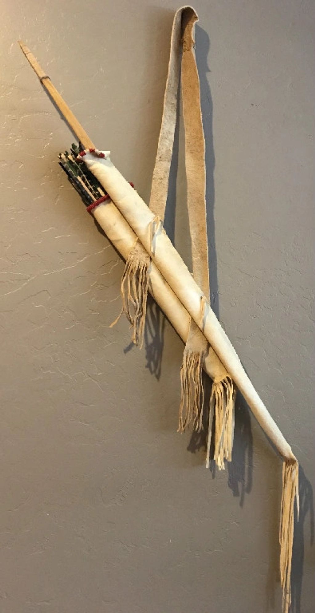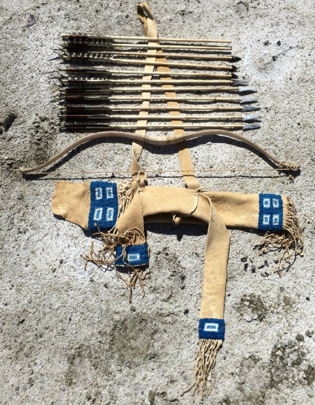 Apache style quiver of brain tanned deer, trade cloth and pigments. Sinew backed gambel oak bow 45" long 74# @ 22". Phragmities and serviceberry arrows.