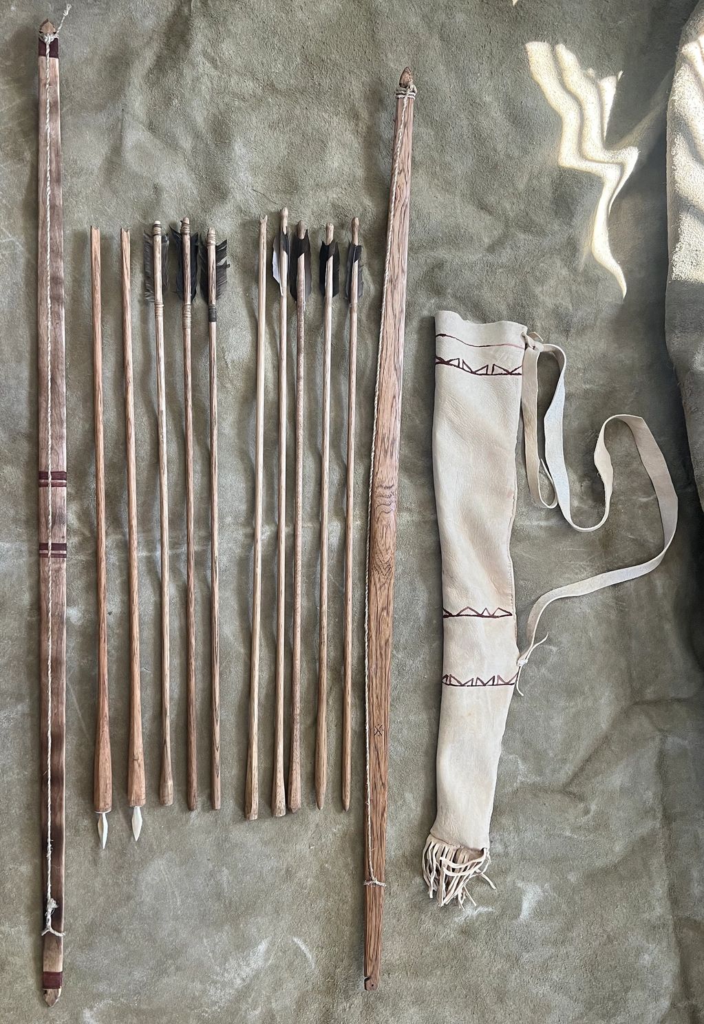 Papago repro set. Quiver of painted brain tanned deer. Bow of neatleaf hackberry with sinew string. Arrows of phragmities with creosote foreshafts pointed with chert.