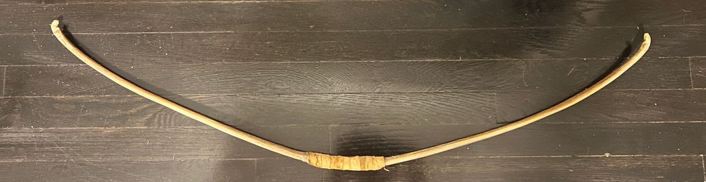 Algonkian style hickory bow with deer rawhide string.